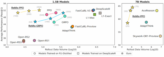 ReMix与其他模型样本效率与平均推理性能对比。该图展示了1.5B与7B模型在五项数学基准上的平均Pass@1准确率随采样数据总量的变化趋势